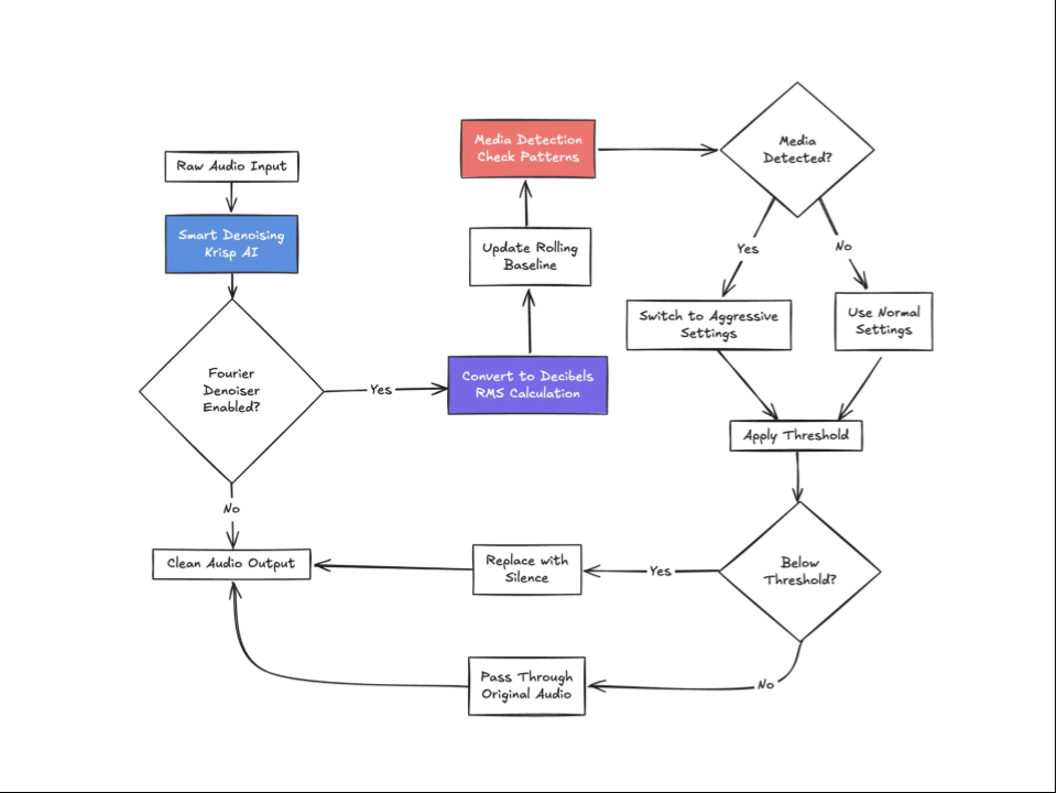 The baseline also updates every 20ms. If a user moves from a quiet room to a loud one, the filter adapts in seconds.