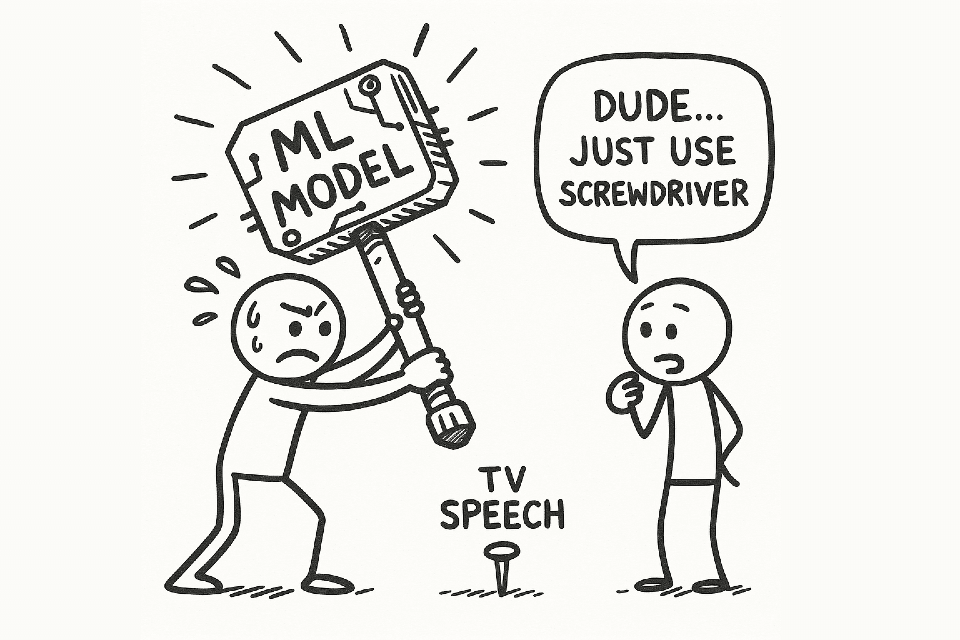 The obvious solution might be to throw more machine learning at the problem. Train a model to distinguish between "primary speaker" and "background media." We considered this, but it introduced several challenges: