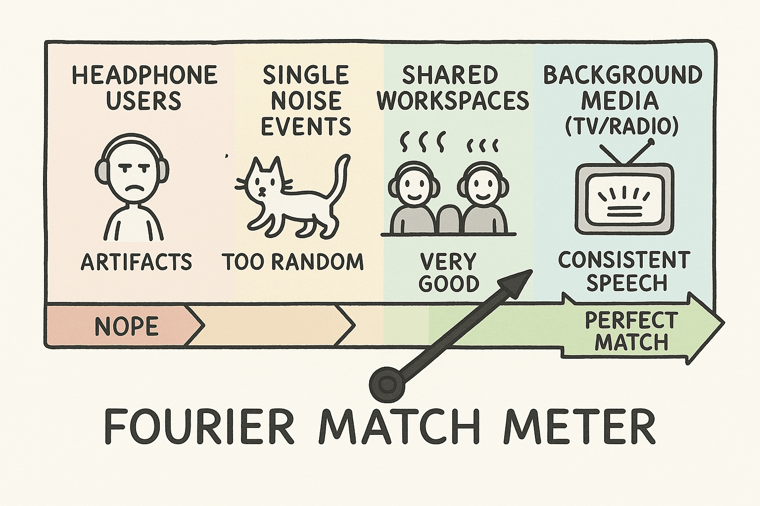 baselineOffsetDb: How aggressive to filter (-30 to -5dB)windowSizeMs: Adaptation speed (1-30 seconds)baselinePercentile: Speech focus (1-99th percentile)mediaDetectionEnabled: Auto-adapt for TV/radioFourier Denoising is labeled experimental because we're still learning from real-world usage. We're exploring: