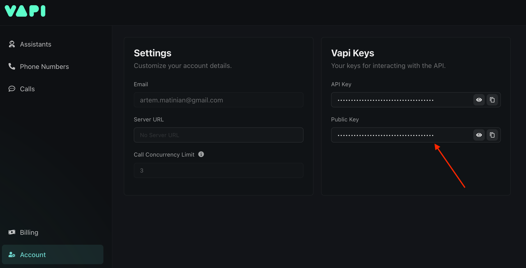 You can find the Vapi public key in your Vapi dashboard, under the Account tab: