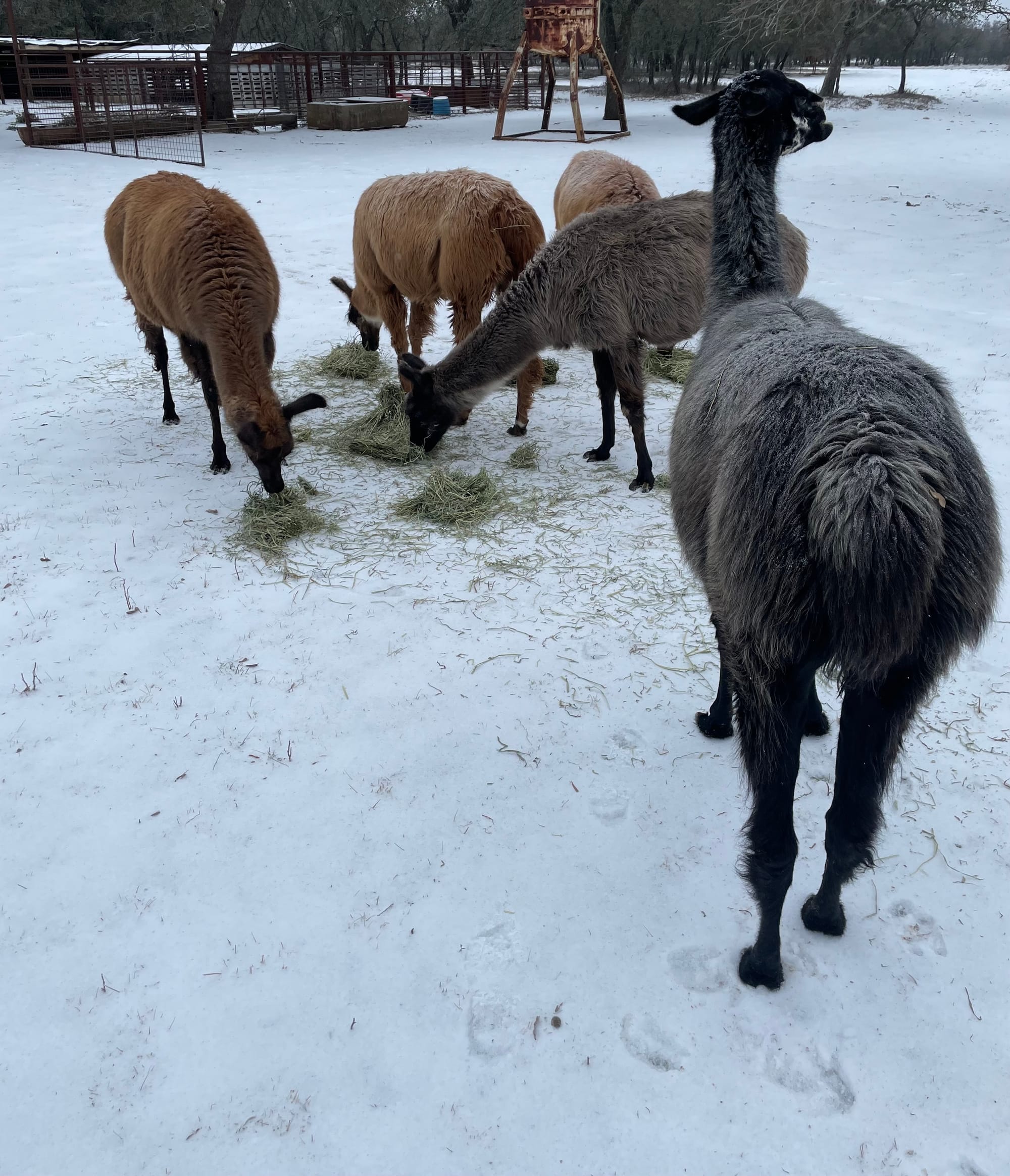 Giving llamas hay during big snow